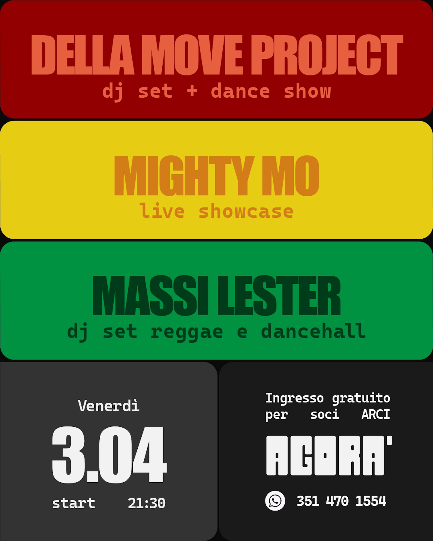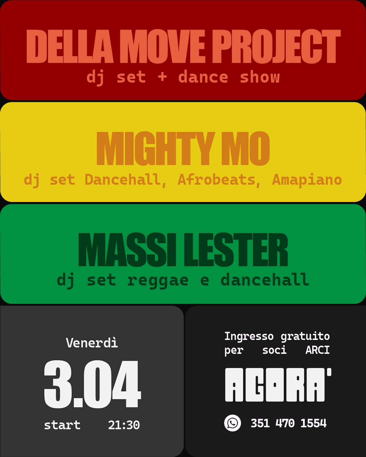 DELLA MOVE PROJECT Dj set/ dance show + MIGHTY MO Dj set Dancehall + MASSI LESTER Dj set reggae & Dancehall